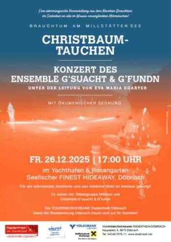 Der Tourismusverband Radenthein/Döbriach gemeinsam mit der Wasserrettung Döbriach zu einer besonderen Brauchtumsveranstaltung an den Millstätter See ein. Das Christbaumtauchen ist eine berührende Tradition im Gedenken an alle im Wasser verunglückten Mitmenschen und verbindet Besinnlichkeit mit festlicher Atmosphäre.