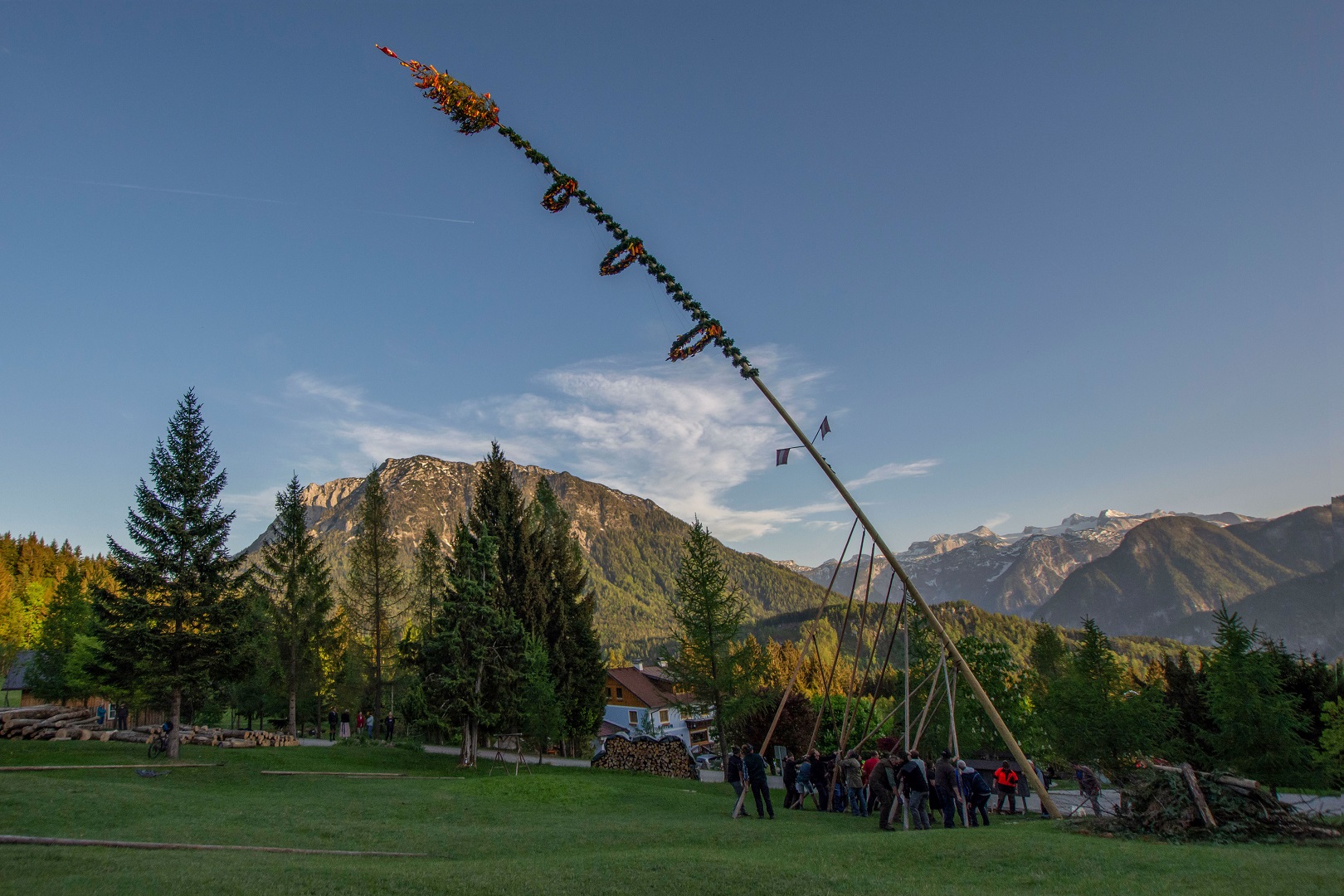 Traditionell wird jedes Jahr am 30. April ein Maibaum in vielen Ortsteilen von Bad Goisern am Hallstättersee aufgestellt.