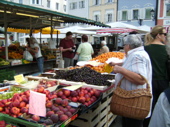 So viel Abwechslung auf so engem Raum ... beim bunten Bauern- und Wochenmarkt warten kulinarische Leckerbissen an jeder Ecke. Das pulsierende Markttreiben wirkt ansteckend und animiert das Staunen, Kaufen und Genießen.