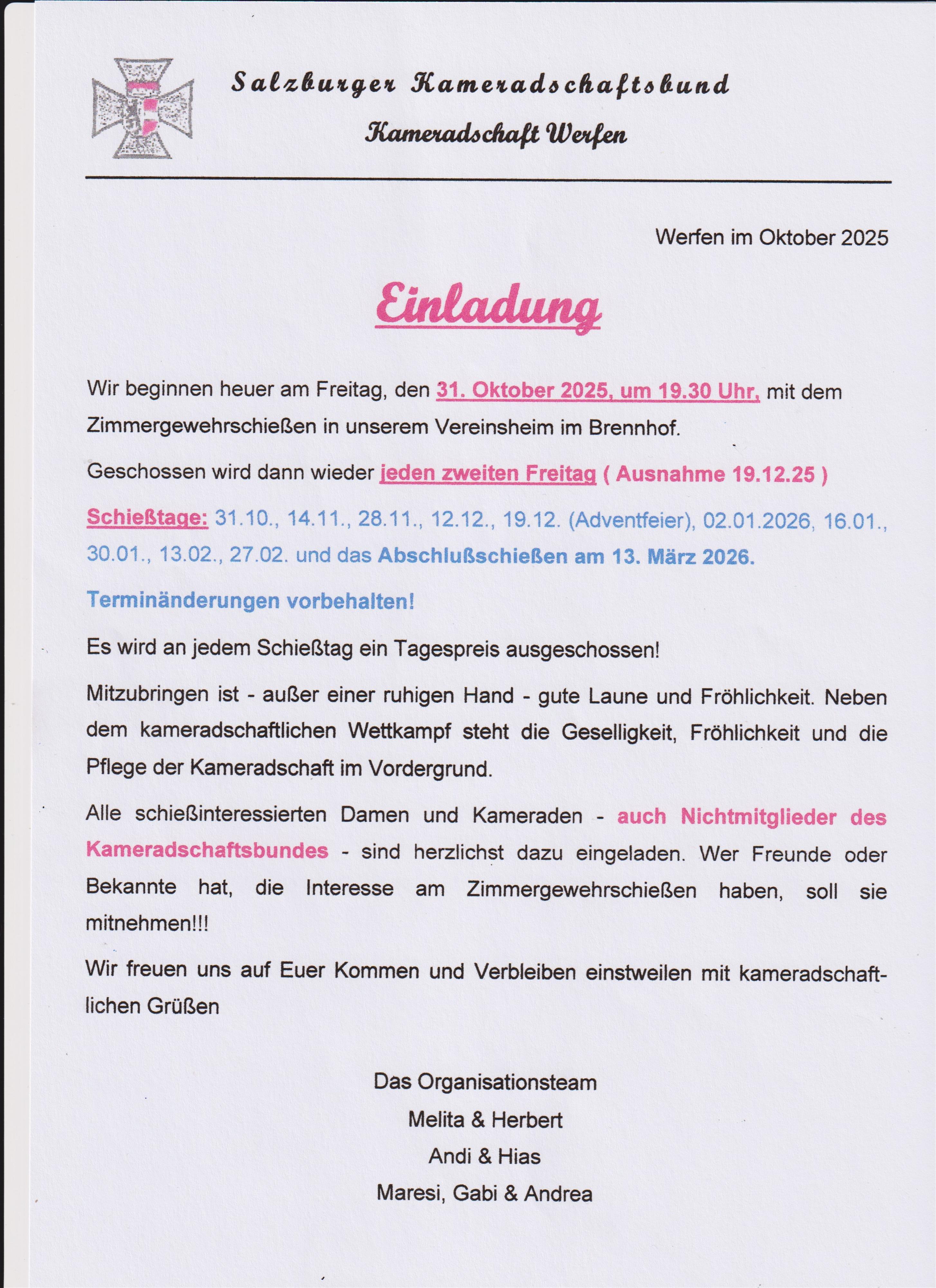 Am 31. Oktober 2025, um 19:30 Uhr beginnt wieder das Zimmergewehrschießen im Vereinsheim des Kameradschaftsbundes in Werfen.