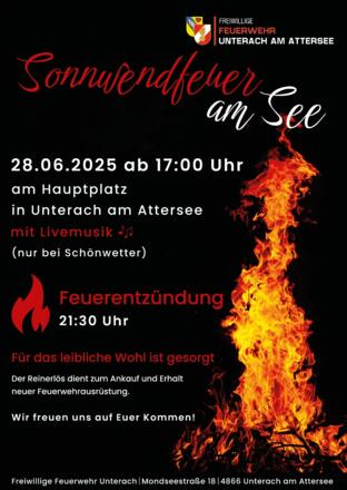Die freiwillige Feuerwehr Unterach am Attersee lädt zur Feuerentzündung mit musikalischer Unterhaltung am Attersee. Für das leibliche Wohl wird gesorgt.