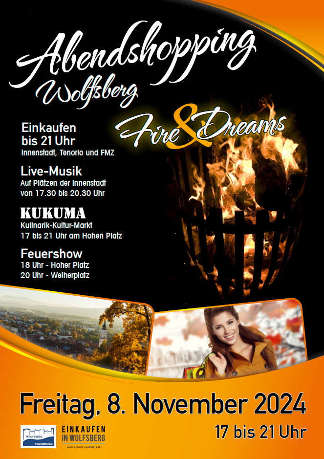 Unter dem Motto „Fire & Dreams“ beleuchten anstelle der gewohnten Straßenbeleuchtung nur der Mond und das Feuer Ihre abendliche Shoppingtour durch die Straßen der Innenstadt von Wolfsberg, die zum Verweilen einlädt, wobei auch die Geschäfte des Fachmarktzentrums und des Tenorios bis 21 Uhr für Sie geöffnet halten.
