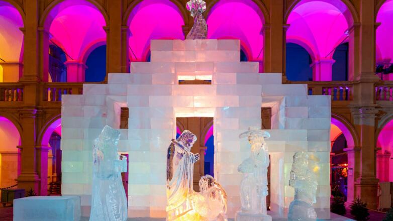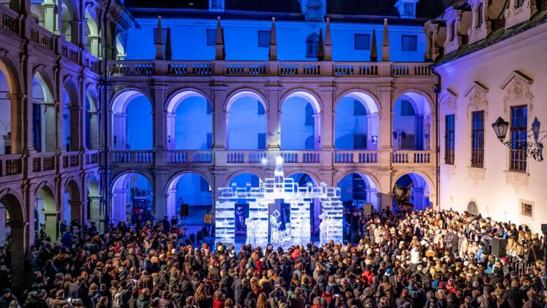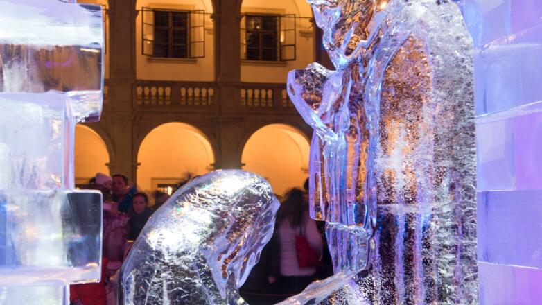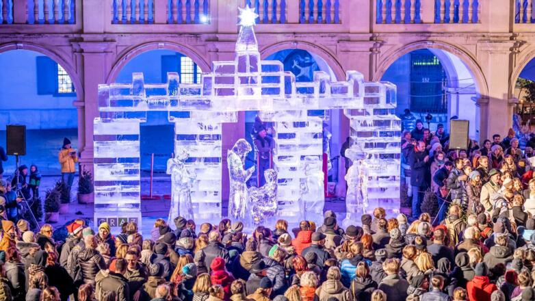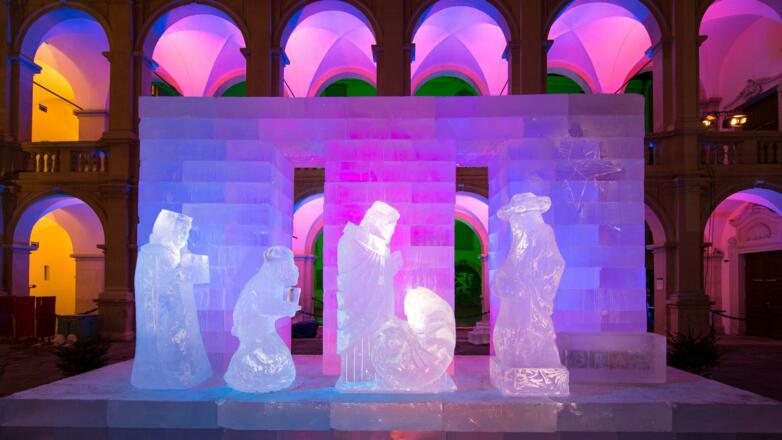 Sie ist der magische Anziehungspunkt im Advent: die Eiskrippe im Landhaushof. Rund 35 Tonnen Eis modelliert der Eiskünstler Kimmo Frosti mit seinem internationalen Eisschnitzer-Team zu einem einzigartigen Kunstwerk.