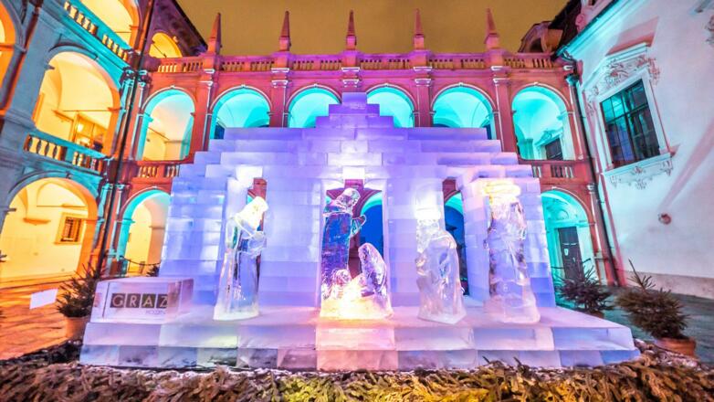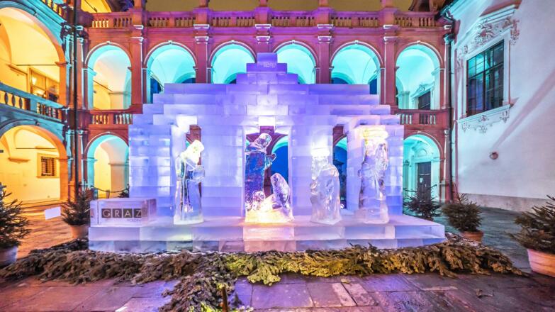 Die Eiskrippe und die lebensgroßen Krippenfiguren sind zweifellos auch in diesem Jahr ein einzigartiges, wenn auch vergängliches, Kunstwerk. Denn auf die Eiskrippe im Renaissancehof des Grazer Landhauses hat es der Winter ganz besonders abgesehen: Jedes Jahr zu Adventbeginn wird die Krippe aus 35 Tonnen kristallklarem Eis geschnitzt, und als sei es ein besonderer Spaß, schickt er daraufhin gern ein paar frostige Nächte aber manchmal auch schön laue Tage. So wird’s den Besuchern im Landhaushof wenigstens nicht so schnell kalt, und falls die Krippe zu sehr leidet, übernimmt eine zweite und dritte Figurengarnitur den anspruchsvollen Job der Stimmungsverbreitung.