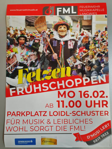 Am Parkplatz vor dem Schuhreparaturgeschäft Loidl lädt die Feuerwehr Musikkapelle Langwies zum FETZEN-FRÜHSCHOPPEN. Ab 11:00 Uhr ist für Musik und das leibliche Wohl gesorgt.