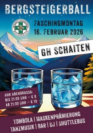 Traditioneller Maskenball der Bergrettung Grünau im Gasthof Schaiten mit Maskenpämierung, Tanz und Tombola.