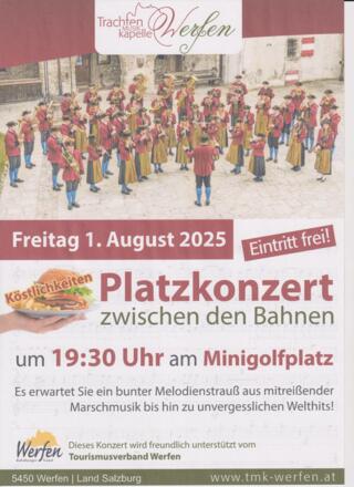 01.08.:Platzkonzert der Trachtenmusikkapelle Werfen ab 19.30 Uhr am Minigolfplatz in Werfen, für das leibliche Wohl ist bestens gesortgt, Eintritt frei!
