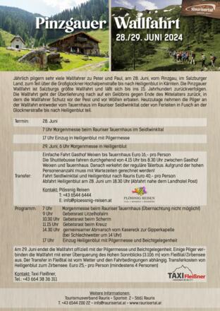 Die Glocknerwallfahrt ist die größte Wallfahrt in Salzburg. Nach der Messe um 7 Uhr im Rauriser Tauernhaus treten die Pilger den langen Marsch nach Heiligenblut an, unterwegs werden mehrere Gebetsrasten eingelegt. Shuttlebusse verkehren laufend vom Parkplatz Weixen zum kurz vor dem Tauernhaus ab 4.15 Uhr. Parkmöglichkeit für PKWs beim Gasthof Weixen. Informationen: Taxi- und Ausflugsfahrten Plössnig Tel: +43 6544 6444.