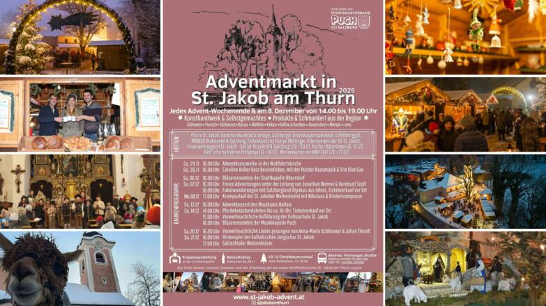In St. Jakob am Thurn findet jeden Samstag und Sonntag im Advent, sowie am 8. Dezember (Feiertag) von 14.00 bis 19.00 Uhr ein Adventmarkt am Kirchplatz bei der barocken Wallfahrtskirche St. Jakob statt. Die Adventstände bieten Köstlichkeiten wie frisches Bauernbrot, Bosna, Speck, Maroni, süße Waffeln und warme Getränke wie Glühwein und Punsch an. Dazu finden Sie selbstgemachte Handwerkskunst und viele Geschenksideen für Weihnachten.