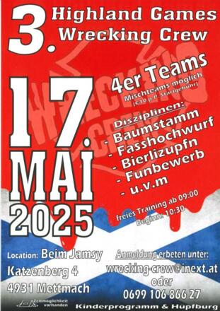 3. Highland Games der Wrecking Crew. Es gibt immer 4er Teams (Mischteams möglich).