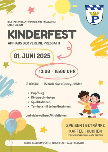 Kinderfest der Stadt Pressath und der Pressather MinisPROGRAMMHüpfburgKinderschminkenBesuch eines Disney-HeldenSpielstationenTombola mit tollen Gewinnenund vielen weiteren AttraktionenSpeisen und Getränke, Kaffee und Kuchen zu familienfreundlichen PreisenBei schlechtem Wetter findet die Veranstaltung in der Stadthalle statt.