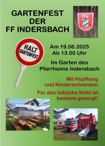 Am Donnerstag, 19.Juni (Fronleichnam) lädt die Feuerwehr Indersbach die gesamte Bevölkerung ab 13.00 Uhr ins Pfarrheim zum alljährlichen Gartenfest ein. Für das leibliche Wohl ist bestens gesorgt.