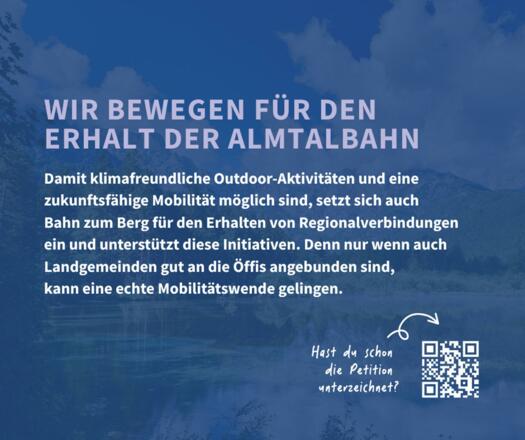Auch die Politik wurde bereits auf den Plan gerufen: So startete Vize-Bürgermeisterin Sigrid Maria Grubmair aus Pettenbach, Bezirk Kirchdorf, eine Petition für den Erhalt der Almtal-Bahn, die innerhalb von kürzester Zeit von über 1.700 Menschen unterzeichnet wurde. Sarah Pallauf ruft dringend auf, die Petition zu unterstützen: