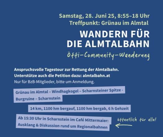 „Wir freuen uns über alle, die kommen und damit zeigen, wie wichtig ihnen Regionalbahnen wie die Almtal-Bahn sind,“ so Sarah Pallauf, Vorsitzende „Bahn zum Berg“, abschließend. „Nur gemeinsam können wir ein Zeichen setzen, dass die Bahn unbedingt erhalten werden muss. Je mehr wir sind, desto wirksamer unser Protest.“