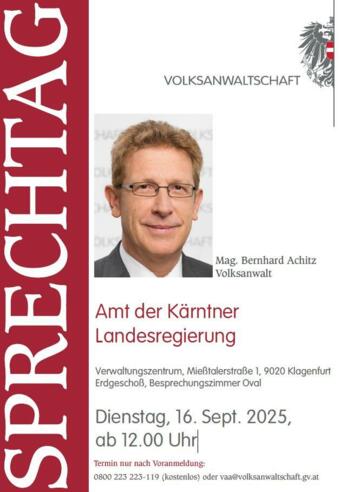 Termin nur nach Voranmeldung: 0800 223 223-119 oder vaa@volksanwaltschaft.gv.at