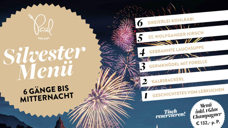 Das ist der plan: Aperitif über den Dächern von St. Wolfgang auf unserer winterloungigen Seeterrasse, danach ein exklusives 6-Gang-Silvestermenü. Bei cooler Stimmung und einem grandiosen Feuerwerk feiern wir auf unserer Seeterrasse ins neue Jahr. PROSIT!