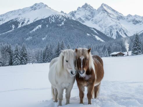 Erlebe den Zauber von verschneiten Wäldern und einer klaren Winterluft bei einer tierisch gemütlichen Familienwanderung in Begleitung von den Zwergpony's "Rubina & Willi" durch die glitzernde Winterlandschaft.