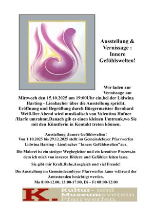Von 1.10.2025 bis 29.12.2025 stellt im Gemeindefoyer Pfarrwerfen Lidwina Harting - Lienbacher "Innere Gefühlswelten"aus.