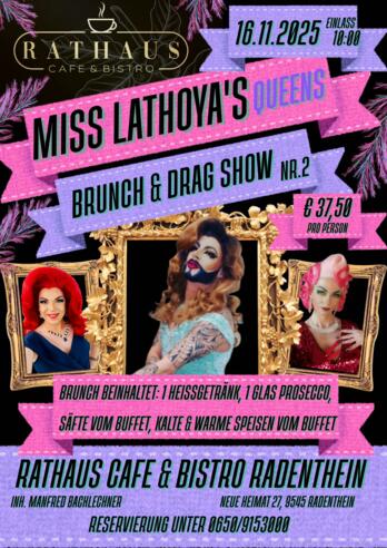 Das Rathaus Café & Bistro Radenthein wird zur Bühne voller Glamour, Glitzer und Entertainment: Bei Miss Lathoya’s Queens – Brunch & Drag Show Nr. 2 erwartet die Gäste ein einzigartiges Show-Erlebnis mit atemberaubenden Auftritten und kulinarischem Genuss.
