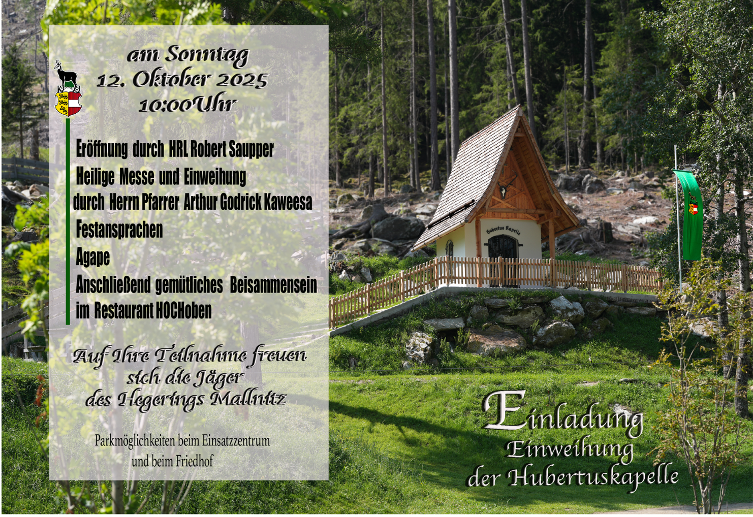 Die Jäger des Hegerings Mallnitz laden sehr herzlich zur Hubertusmesse und zur Einweihung der neuen Hubertuskapelle