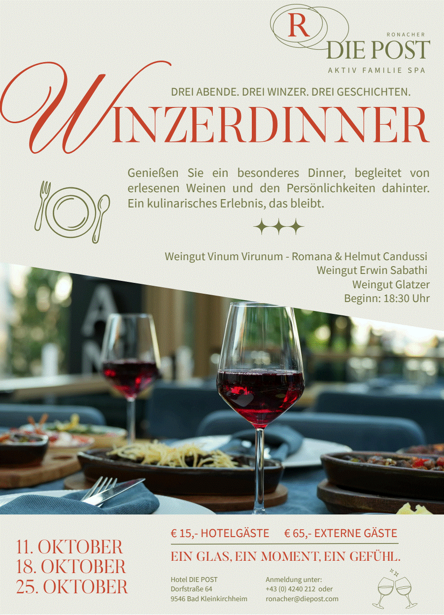 Genießen Sie ein besonderes Dinner, begleitet von erlesenen Weinen und den Persönlichkeiten dahinter. Ein klassisches Erlebnis das bleibt.