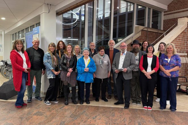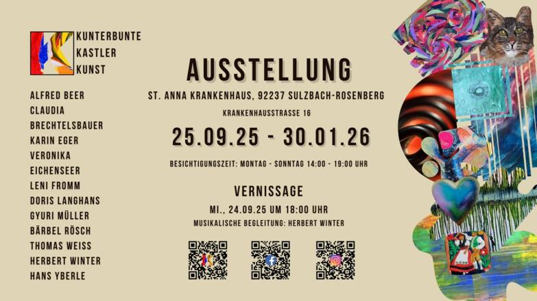 Die Kunst AG des Krankenhauses St. Anna in Sulzbach-Rosenberg präsentiert bis Januar 2026 Malereien und Fotografien der Kastler Künstlergruppe „Kunterbunte Kastler Kunst“. Die Ausstellung wurde kürzlich mit einer Vernissage eröffnet, Herbert Winter lieferte dazu den musikalischen Rahmen mit eigenen Kompositionen und Gitarrenmusik.