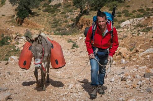 „180 Kilometer mit einem sturen Esel durch das bedrohliche Heilige Land. Von den Bergen Galiläas durch Olivenhaine, die Tiefen des Jordantals, die sengende Hitze der judäischen Wüste, begleitet von gastfreundlichen Hirten und Herden bis hin zum Stall in Bethlehem. Ein Pfad, auf dem ich viele Grenzen überwinden und mich häufig fragen musste, wer hier eigentlich der Esel ist“.