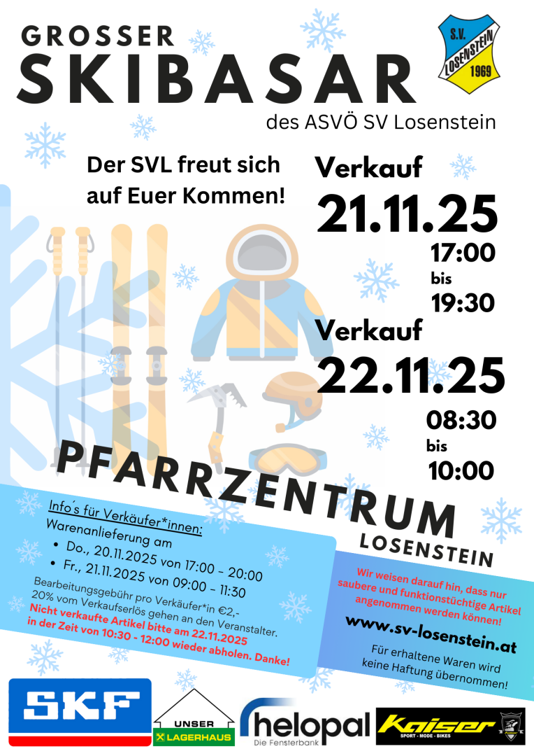 Am 21. und 22. November 2025 findet der beliebte Skibasar des ASVÖ SV Losenstein im Pfarrzentrum Losenstein statt.