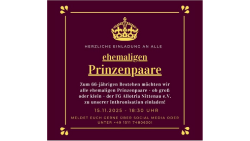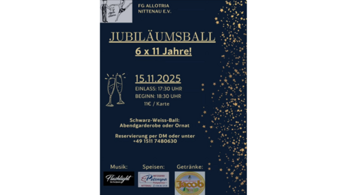 Jubiläumsball - 6 x 11 Jahre!Unsere Jubiläumssaison steht bevor - Wir werden 66! Aus gegebenen Anlass laden wir alle Faschingsnarren, Tanzbegeisterte und Freunde zu unserem Jubiläums.- und Inthronisationsball ein. Feiert gemeinsam mit uns und macht diesen Abend unvergesslich. Die Partyband Flashlight wird den Abend musikalisch begleiten. Weiterhin verzaubern euch unsere Gardemädels, sowie das Männerballett, mit ihren Aufführungen in den Tanzpausen.Für das leibliche Wohl sorgt die Metzgerei Potempa, sowie die Familienbrauerei Jakob.Gerne könnt ihr euch jetzt schon Karten reservieren per DM oder unter Tel. +49 1511 7480630.Eure FG Allotria Nittenau e. V.Einlass: 17:30 UhrBeginn: 18:30 UhrEintritt: 11 Euro