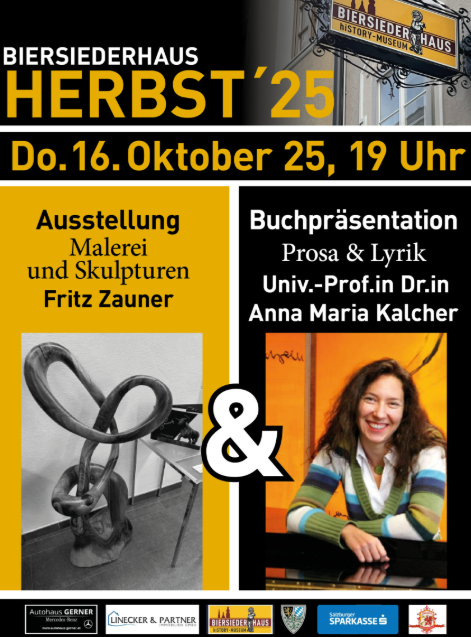 Das Biersiederhaus lädt herzlich ein zur Präsentation des neuen Buches „Prosa & Lyrik“ von Univ.-Prof.in Dr.in Anna Maria Kalcher. Zeitgleich können Sie die Ausstellung mit Malereien und Skulpturen von Fritz Zauner besuchen, die den literarischen Abend künstlerisch begleiten und vertiefen.