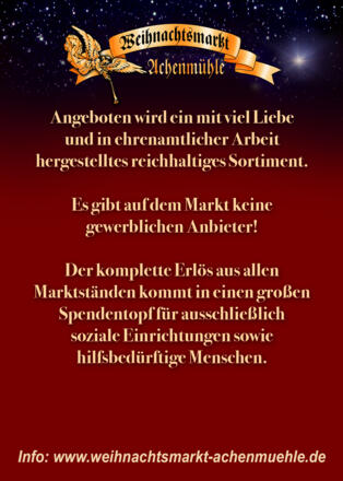 Was einst im Frühjahr 1990 mit der Gründung eines eigenen Vereins begann, ist heute eine feste Größe in der Region: ein Weihnachtsmarkt, bei dem ausschließlich Vereinsmitglieder und Freunde des Vereins ihre selbst gefertigten Waren anbieten - ganz bewusst ohne gewerbliche Verkaufsstände. Der gesamte Erlös wird für soziale Zwecke gespendet.