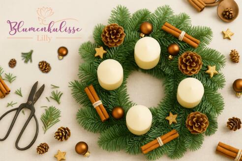 Die Blumenkulisse Lilli sorgt für Inspiration und eine stimmungsvolle Atmosphäre, während du kreativ wirst und deinen persönlichen Kranz für die Adventzeit bindest. Ein gemütlicher, kreativer Moment, der die Vorfreude auf die Adventzeit noch schöner macht.