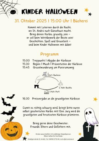 Am Freitag, dem 31. Oktober 2025, lädt die Stadtgemeinde St. Andrä zum Kinder Halloween ein.