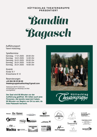 Theateraufführung der Theatergruppe Hüttschlag. Es wird das Stück "BanditnBagasch", eine ländliche Komödie in drei Akten von Ralph Wallner aufgeführt. Preis: € 7,00 pro Kind, € 12,00 pro Erwachsene. Karten-Reservierung: unter +43 (0) 664 / 99 22 6600 oder theatergruppehuettschlag@gmail.com. Der Saal wird 90 Minuten vor der Aufführung geöffnet, freie Platzwahl.