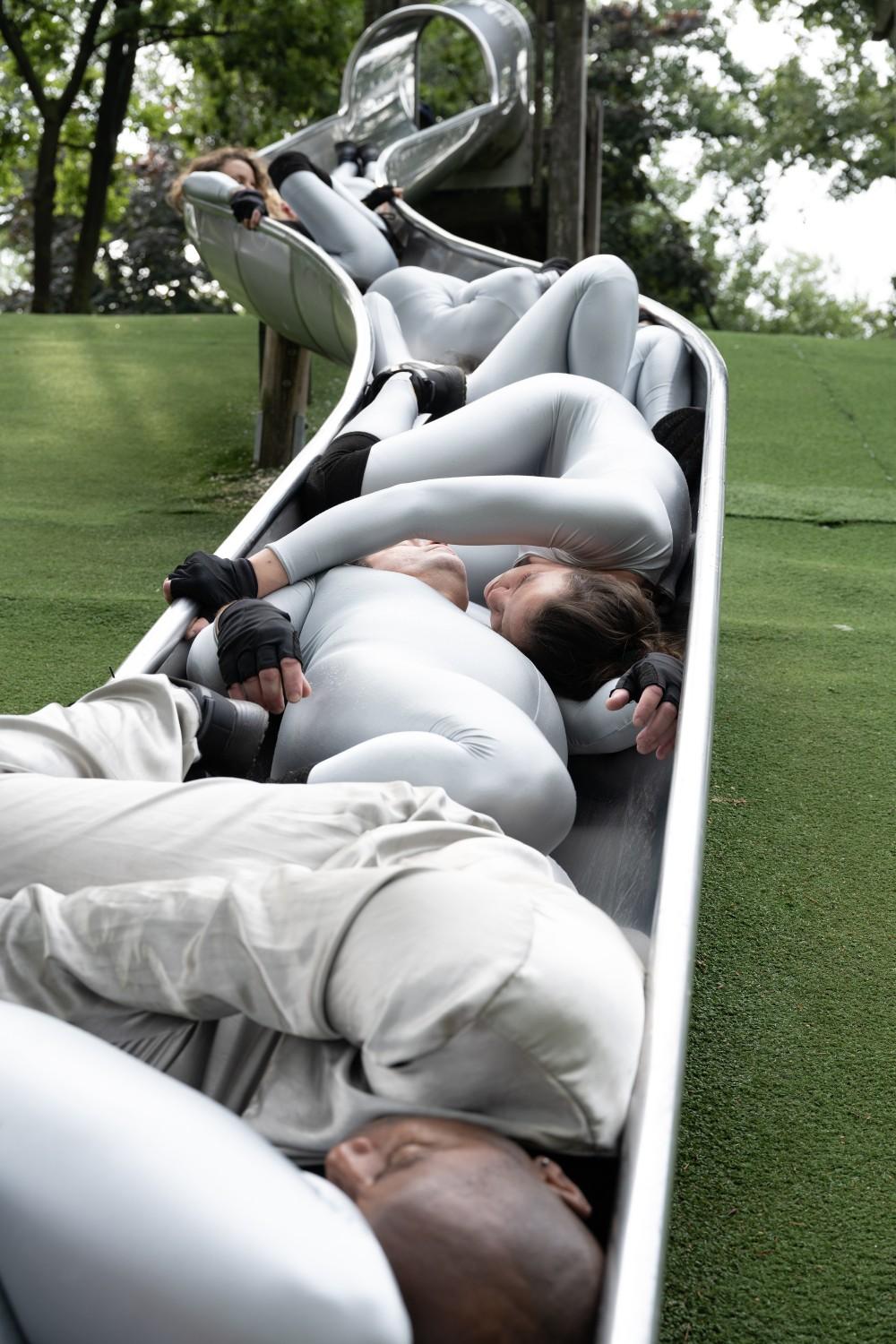 Die Performer*innen verschiedener Generationen vollziehen ihre Bewegungen in extremer Langsamkeit, in stockendem Fluss oder bieten sich, plüschkostümiert und mit Körpererweiterungen, selbst zum Spielzeug für die anderen an. Dabei geht Doris Uhlich dem Gefühl der Melancholie nach.