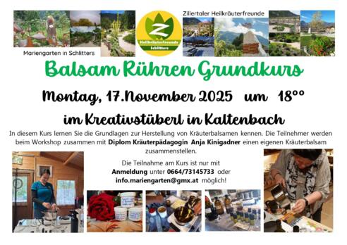 In diesem Kurs lernen Sie die Grundlagen zur Herstellung von Kräuterbalsamen kennen. Die Teilnehmer werden beim Workshop gemeinsam mit Diplom Kräuterpädagogin Anja Kinigadner einen eigenen Kräuterbalsam zusammenstellen.
