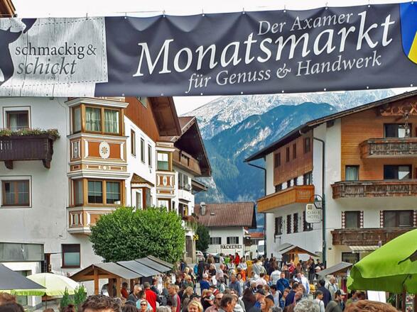 Monatlicher Markttag in Axams direkt am Dorfplatz! Jeweils immer am ersten Samstag im Monat von März bis November! Angebot von regionalen, frischen Produkten, saisonalen Fleisch, Speck und Wurstspezialitäten, Gemüse, Milchprodukte, Honig, verschiedenstes Handwerk und Handarbeiten, Messerschleifer und vieles mehr. Kulinarisches Highlight: die berühmten Axamer Blattl’n und Kiachl mit Kraut oder Preiselbeeren, knusprige Brathendln, Bosnas, Fleischkäse uvm.!