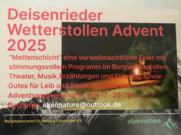 "Mettenschicht" eine vorweihnachtliche Feier mit stimmungsvollem Programm in Bergwerkstollen. Theater, Musik, Erzählungen und Führung sowie Gutes für Leib und Seele.