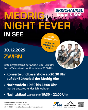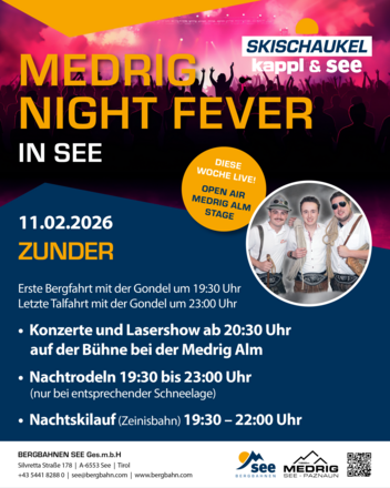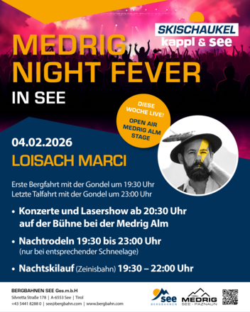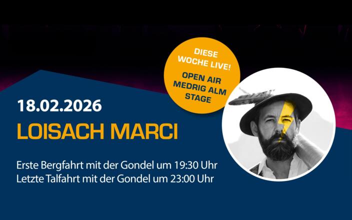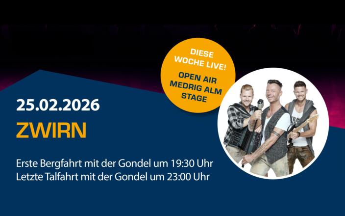 - 20:30 Uhr bis ca. 22:00 Uhr: Live Konzert auf der Medrig Alm Bühne
