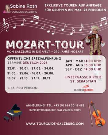 Die Geschichte, die seit über 270 Jahren Salzburg prägt, mit den wichtigsten Stationen: das Geburtshaus in der Getreidegasse, Mozarts Wohnorte, Wirkungsstätten und seine Lieblingsplätze. Lebhafte Geschichten aus seiner Kindheit, über seine ausgedehnten Reisen, seine Familie und überraschende Anekdoten über seine Marotten, seinen Humor und persönlichen Geheimnisse, die selbst eingefleischte Mozart-Fans begeistern. Diese Tour ist ideal für Musikliebhaber, Geschichtsinteressierte und neugierige Besucher, die Salzburg und seinen berühmtesten Sohn auf besondere, humorvolle und lebendige Weise entdecken wollen.