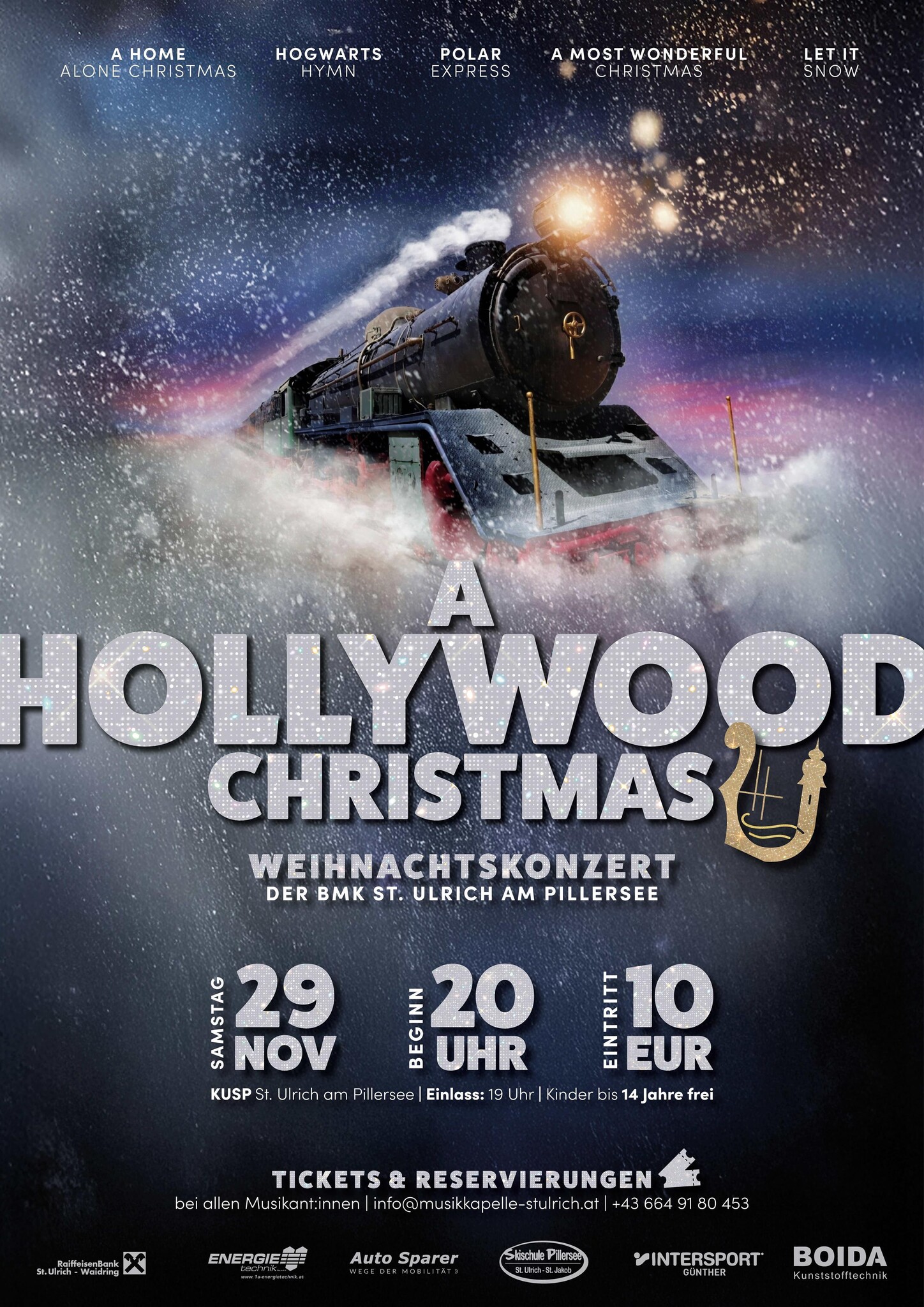 Stimmungsvolles Weihnachtskonzert unter dem Motto "A Hollywood Christmas"der BMK St. Ulrich am Pillersee | Tickets & Reservierungen: bei allen Musikant:innen, info@musikkapelle-stulrich.at, +43 664 9180453 | Kosten: € 10,-, Kinder bis 14 Jahre frei | Treffpunkt: Kultur- & Sportzentrum Pillersee, Dorfstraße 17, 6393 St. Ulrich a. P. | Sonstiges: Einlass 19:00 Uhr