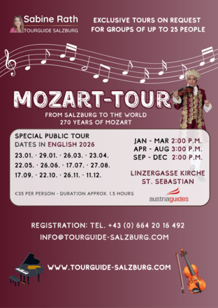 Die Geschichte, die seit über 270 Jahren Salzburg prägt, mit den wichtigsten Stationen: das Geburtshaus in der Getreidegasse, Mozarts Wohnorte, Wirkungsstätten und seine Lieblingsplätze. Lebhafte Geschichten aus seiner Kindheit, über seine ausgedehnten Reisen, seine Familie und überraschende Anekdoten über seine Marotten, seinen Humor und persönlichen Geheimnisse, die selbst eingefleischte Mozart-Fans begeistern. Diese Tour ist ideal für Musikliebhaber, Geschichtsinteressierte und neugierige Besucher, die Salzburg und seinen berühmtesten Sohn auf besondere, humorvolle und lebendige Weise entdecken wollen.