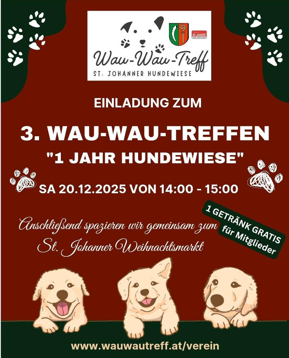 Sei dabei beim 3. WAU-WAU-TREFFEN in der St. Johanner Hundewiese. Aufgrund der 2 Teilbereiche für GROßE & KLEINE Hunde bestens geeignet.