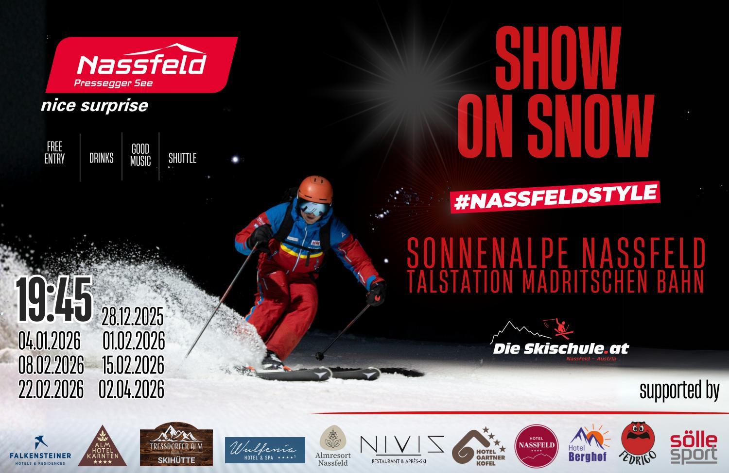 Die Show on Snow findet bei den Babydoppelliften in der Hotelzone am Nassfeld statt.