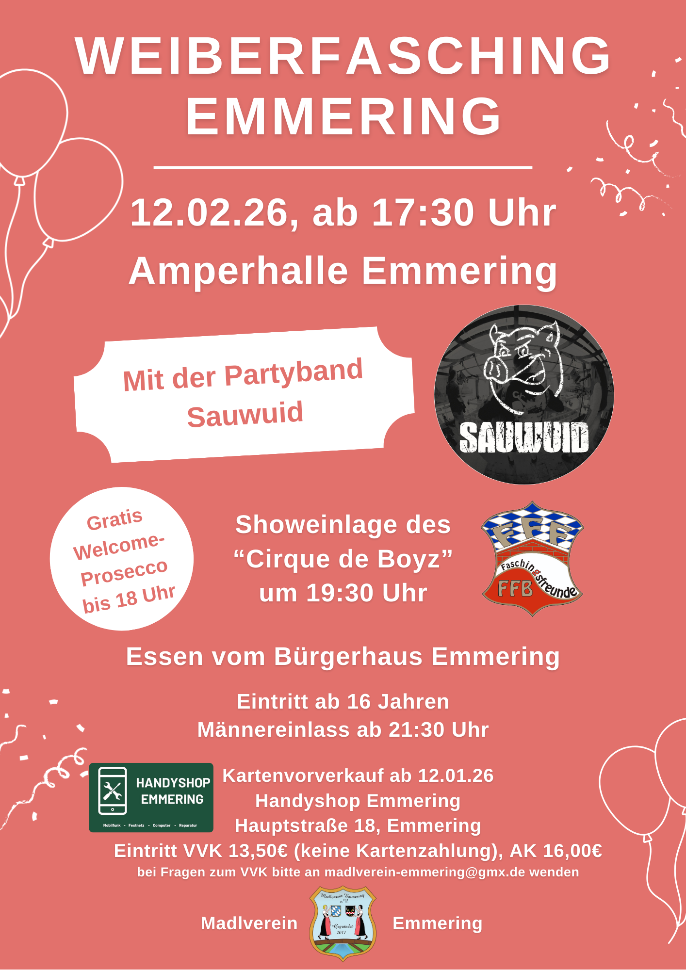 Die Karten sind ab dem 12.01.26 im Handyshop Emmering (Hauptstraße 18) zum Preis von 13,50€ erhältlich. Im Vorverkauf ist keine Kartenzahlung möglich. Bei Fragen zum Vorverkauf bitte an madlverein-emmering@gmx.de wenden.