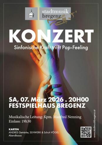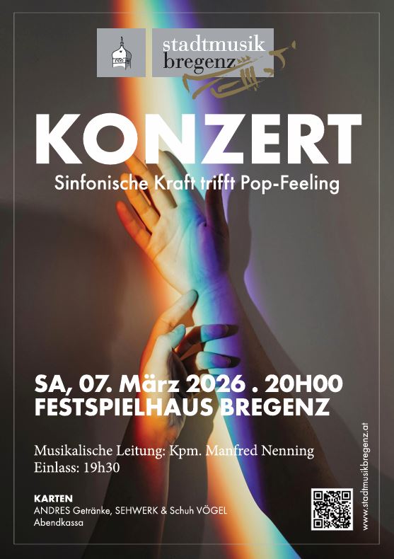 Beim kommenden Konzert im März präsentiert die Stadtmusik Bregenz unter der musikalischen Leitung von Kpm. Manfred Nenning ein abwechslungsreiches Konzertprogramm zwischen sinfonischer Klangpracht und modernen Pop- & Filmmusikeinflüssen. Im ersten Teil erklingen Werke von Steven Reineke, James Swearingen und Armin Kofler. Im zweiten Teil entfaltet die Stadtmusik Bregenz ihre gesamte stilistische Bandbreite. Dort trifft Filmmusik auf Pop, Leidenschaft auf Energie. Glitzernde Musicalmomente, dramatische Bond-Atmosphäre und mitreißende Hits legendärer sowie aktueller Pop-Ikonen sorgen für eine dynamische Reise durch die moderne Musikwelt. Moderne Rock- und Popsongs in symphonischen Arrangements zeigen zudem, wie kraftvoll und facettenreich Blasmusik heute klingen kann – ein fulminantes Finale voller Emotion, Rhythmus und Glanz.