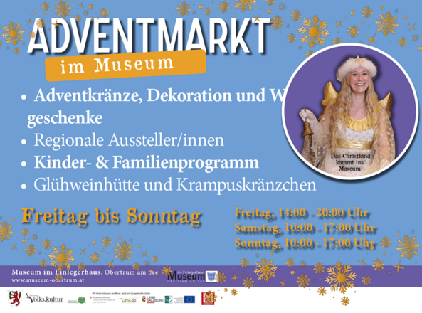 Mit dem traditionellen Adventmarkt im Museum wird in Obertrum die Weihnachtszeit eingeläutet. In diesem Jahr wird der Adventmarkt von Freitag. 21.11. bis Sonntag, 23.11. mit einem umfangreichen Programm stattfinden. Es wird wieder handgemachte Adventkränze und verschiedene Weihnachtsdekorationen geben.