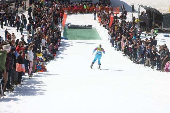 Beim Waterslide geht’s darum, mit Ski oder Snowboard so weit wie möglich über ein 8–10 Meter langes Wasserbecken zu gleiten – ohne nass zu werden! Jeder, der’s schafft, darf in die nächste Runde – und mit jedem Durchgang wird’s schwieriger. Spannung und gute Stimmung sind garantiert!