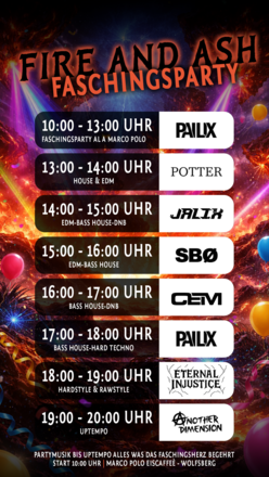 Die Fire & Ash Party ist eine jährlich stattfindende Faschingsveranstaltung mit wechselndem Motto, die sich in den letzten Jahren als fixer Bestandteil des regionalen Faschings etabliert hat. Das Event verbindet klassisches Faschingsfeeling mit einem modernen, festivalartigen DJ-Konzept und richtet sich an ein breites Publikum aus der Region.