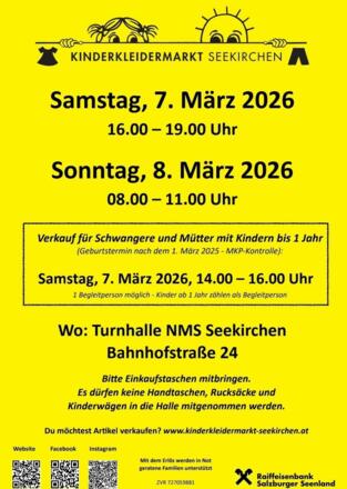 Der nächste Kinderkleidermarkt findet am 7. und 8. März in der neuen Mittelschule Seekirchen statt.